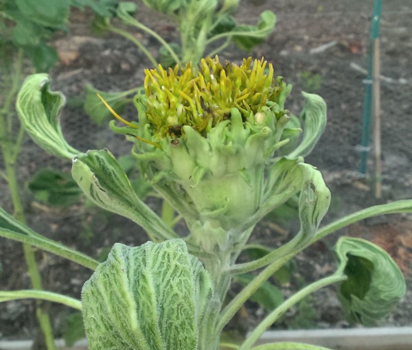 TMV causes new growth to come out deformed and curled up beyond recognition (that symptom, by the way, is impossible to differentiate from 2,4-D damage).ย  Check!ย  However, TMV also causes other symptoms, like, you guessed it, a mosaic pattern on the leaves.ย  I donโ€™t have this on a single plant.ย  Moving on.