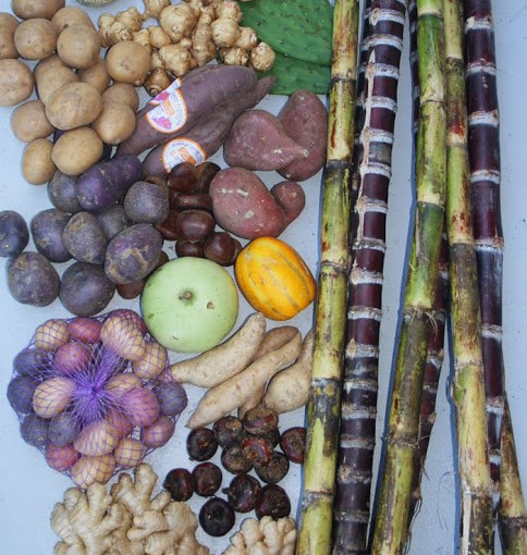 All of these items are getting planted. The dark red sugar cane is a type I’ve never seen before… and the other veggies are all great for starting. I’ll pop the water chestnuts in a tub, scoop the seeds from the squash, plant the nopale pads, set the potatoes in a sunny windowsill, get the sweet potatoes sprouting and generally have fun trying all these new plants out.