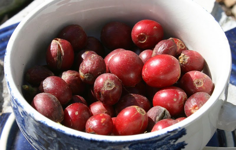 The fruit is still green in November, so I am worried that it is getting too cold for it to complete ripening, as this takes 37 weeks from flower to red fruit. The coffee plants range from 3-5 feet and are beautifully lush shiny green leaves โ very healthy looking. I will be giving them more TLC over these colder months with compost tea and some extra water.
