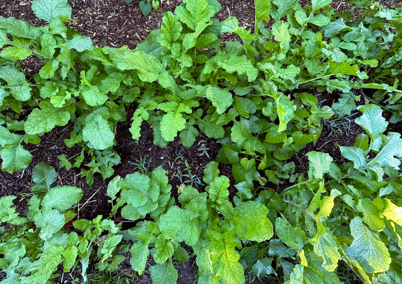 This double row is an overhead shot of the daikons. We planted multiple large-rooted types of radish in the spring, then saved seeds. These were grown from those seeds. So far, so good. We’ll see how the roots turn out.