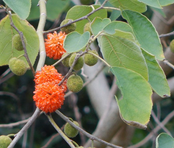 Those strange orange pom-poms are the fruit of a paper mulberry tree, also known as Broussonetia papyrifera or “HOLY MOLY!!! HOW DO I GET RID OF THIS THING IT’S EVERYWHERE!!!???”