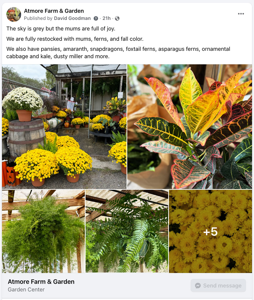 It’s amazing how many mums sell here in the Deep South. They are incredibly popular for porches right now. They don’t last all that long, but they look amazing for a bit. Rather like the ferns everyone hangs on their porches in spring.